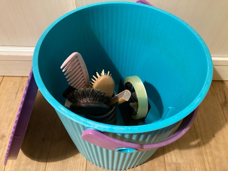 寝る前にはこのバケツに、周囲に散らかっているものをしまうようにしています。