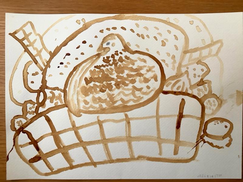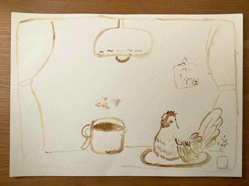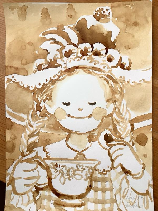 それがインスタントコーヒーの優しい茶色だと、どれもふんわり優しくまとまる気がして、なんだかほっこりした気持ちで筆を筆を走らせることができました。最近、絵を描くことを難しく考えてしまって楽しむことを忘れていました。お客様に喜んでもらえるような作品を作っていくためにも、自分が楽しくワクワクしながら描くということを大切にしていきたいなぁと思います。
